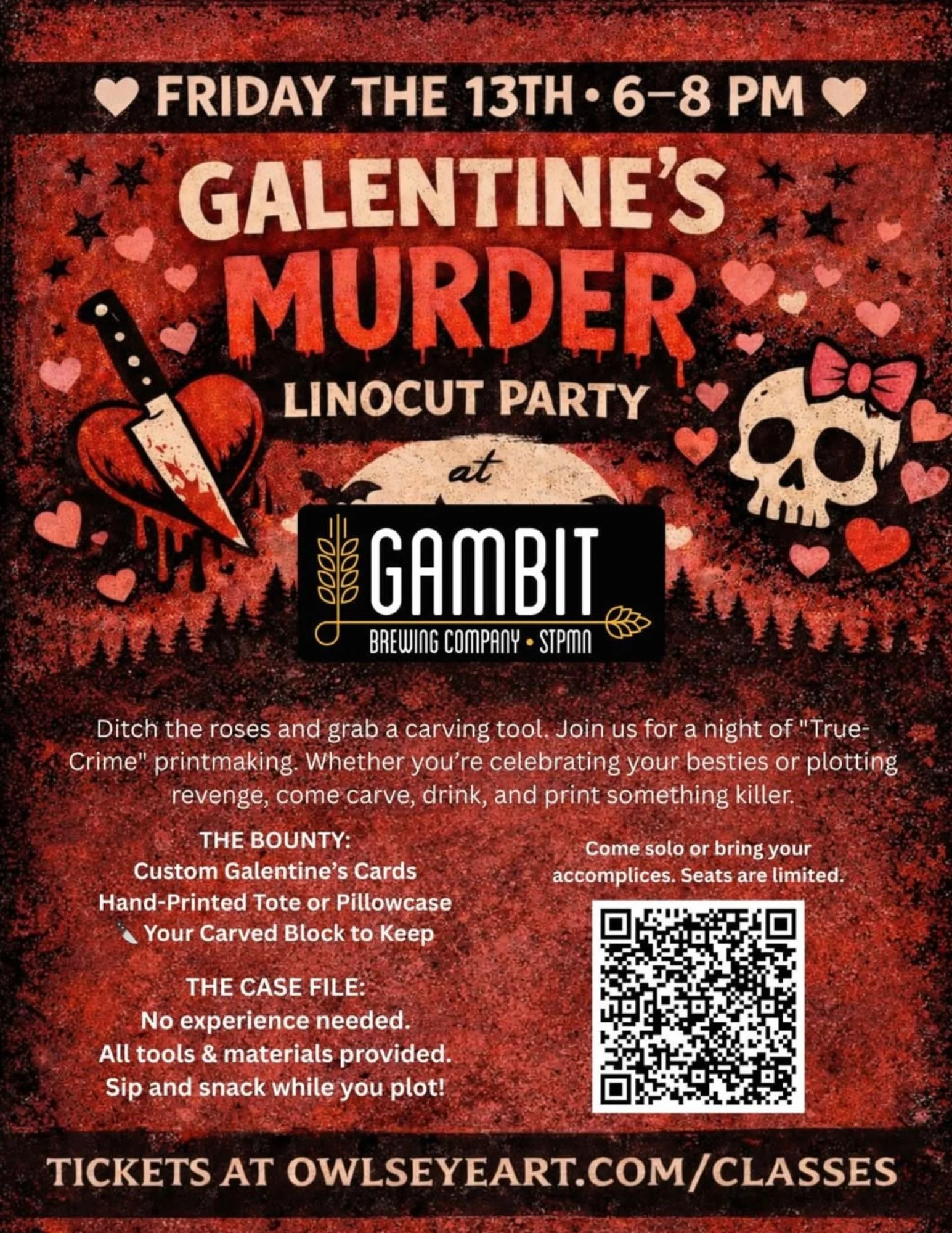 Forget the chocolate-covered strawberries. This Friday the 13th, we’re heading to Gambit Brewing for a Galentine’s night that’s a little bit "sweet" and a lot "crime scene." It’s time to embrace your inner unhinged Valentine and create some art worth dying for.