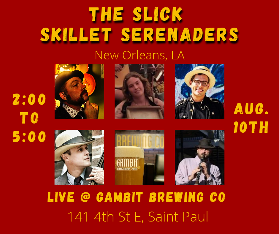 Back to All Events The Slick Skillet Serenaders Sunday, August 10, 2025 2:00 PM 5:00 PM Gambit Brewing Co. 141 4th Street East St. Paul, MN (map) Google Calendar ICS This Sunday, we’ve got the Slick Skillet Serenaders rolling in from New Orleans to fill the taproom with their mix of ragtime, blues, and good-time jazz. It’s the kind of music that makes a beer taste even better.