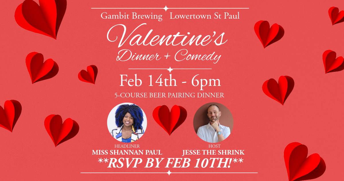 Join us for a wonderful St Paul Valentine's Day featuring a 5-course meal and professional standup comedy with headliner Miss Shannan Paul.